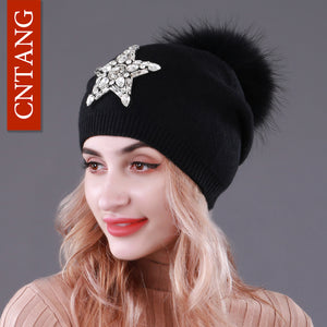 CNTANG Autumn Knitted Wool Hats For Women Winter Warm Caps With Star Rhinestones Natural Raccoon Fur Pompom Hat Female Beanies