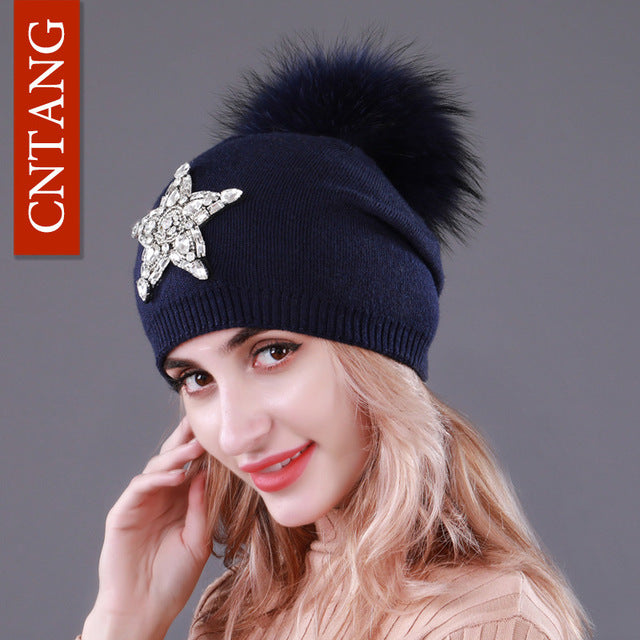 CNTANG Autumn Knitted Wool Hats For Women Winter Warm Caps With Star Rhinestones Natural Raccoon Fur Pompom Hat Female Beanies